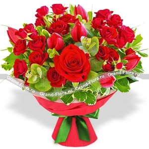Любовь - букет из красных роз и тюльпанов
