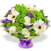 ДЕЛЮКС: роза белая - 15 шт, гербера белая - 9 шт, хризантема кустовая зеленая - 10 шт, статица - 7 шт, салал, фетр из двух слоев - зеленый и фиолетовый, лента. Примерный размер: 45Х45 см.