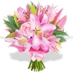 лилия розовая (возможна замена на белую) - 5 шт., роза розовая - 11 шт., салал, натуральная упаковка - розовая.