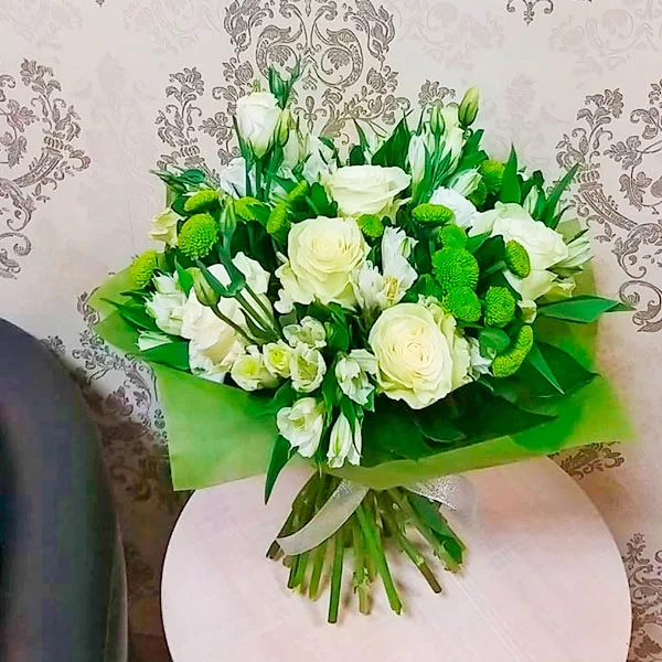 ЛЮКС: роза белая - 9 шт., эустома белая - 5 шт., альстромерия белая - 9 шт., хризантема кустовая зеленая - 7 шт., фетр зеленый.
