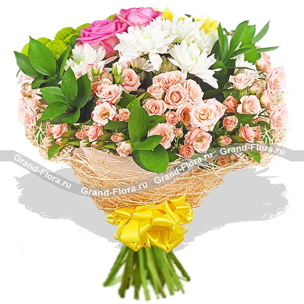 ЛЮКС: роза розовая (аква) - 5 шт, роза кустовая розовая - 6 шт, хризантема кустовая белая - 3 шт, хризантема кустовая зеленая - 2 шт, хризантема одноголовая желтая - 4 шт, рускус, натуральная упаковка, желтый бант.Примерный диаметр букета 40х40 см.