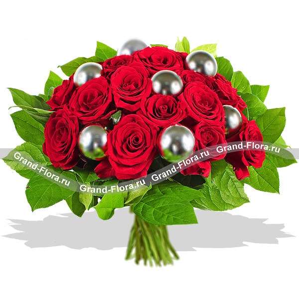 17 роз: 17 красных роз (70см), новогодний декор и зелень, сетка.