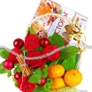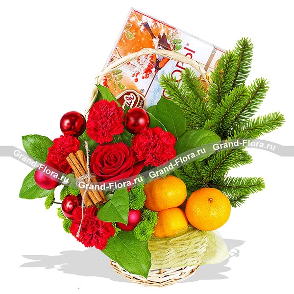 Уменьшенный: гвоздика - 3шт., роза красная - 1шт., хризантема зеленая (сантини) - 1шт., корица, мандарины - 0,5кг., конфеты "Родные просторы" (278 г.) - 1шт., еловая ветвь - 1шт., новогодний декор и зелень, желтый фетр, оазис, корзина малая.