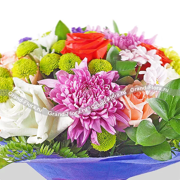 ЛЮКС: роза розовая - 2 шт., роза белая - 2 шт., роза красная - 5 шт., хризантема одноголовая белая - 2 шт., хризантема одноголовая зеленая (шамрок) - 2 шт., хризантема одноголовая фиолетовая - 2 шт., хризантема кустовая зеленая (сантини) - 2 шт., хризантема кустовая розовая - 2 шт., статица - 1 шт., декоративная зелень, фетр фиолетовый, + коробка конфет в подарок.