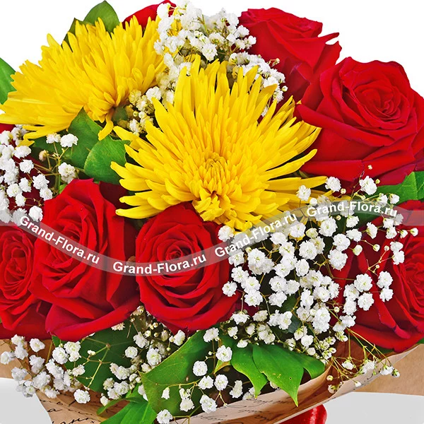 Уменьшенный: роза красная (50 см) - 5 шт., хризантема одноголовая (желтая) - 2 шт., гипсофила - 1 шт., крафт, лента.
