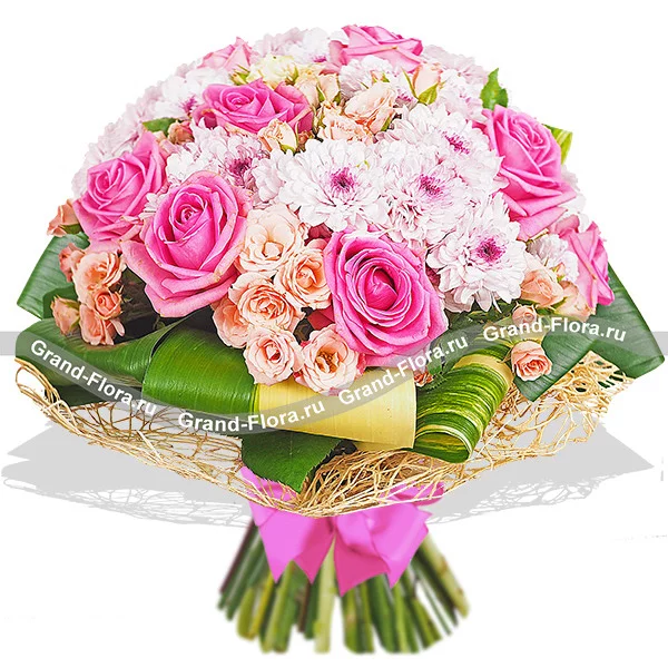 Роза розовая - 15 шт., роза кустовая розовая - 10 шт., хризантема кустовая светло-фиолетовая - 10 шт., лист аспидистры загнутый - 8 шт., упаковка натуральная.