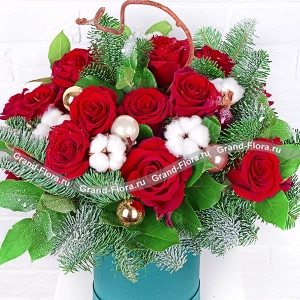 Снежное утро - корзина новогодняя из роз,хризантем и декора