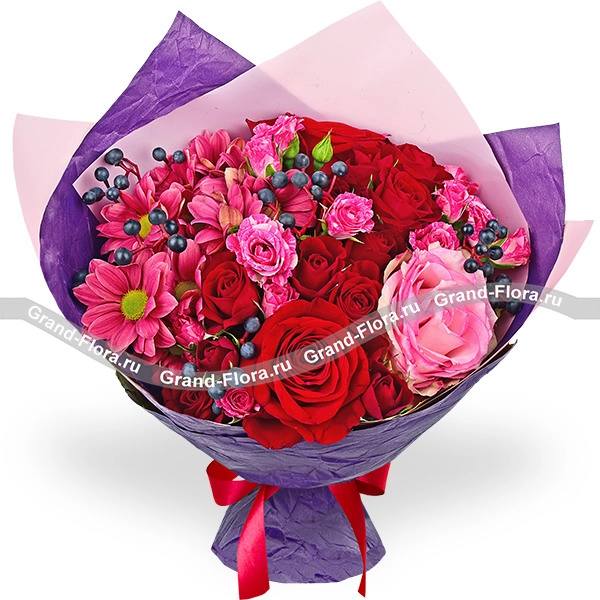 Люкс: роза красная - 5 шт., роза кустовая красная - 4 шт., роза кустовая розовая - 3 шт., хризантема кустовая ромашковая розовая - 3 шт., декор, упаковка, лента. Примерный размер: 40Х40 см.