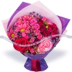 Уменьшенный: роза красная - 1 шт., роза кустовая красная - 2 шт., роза кустовая розовая - 2 шт., хризантема кустовая ромашковая розовая - 2 шт., декор, упаковка, лента. Примерный размер: 20Х20 см.