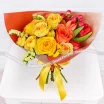 Уменьшенный: роза желтая - 2 шт., роза оранжевая - 2 шт., роза кустовая желтая - 2 шт.,тюльпан оранжевый - 1 шт., тюльпан красный - 2 шт., гиперикум, упаковка, лента. Примерный размер: 25Х25 см.