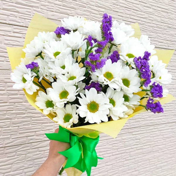 Искал букет с ромашками, нигде не мог найти. Когда позвонил в службу, мне пояснили, что в это время года ромашка не поступает в магазины, но кустовые хризантемы ничем не отличаются от ромашки. Выбрал этот букет в люксовом варианте, смотрится очень достойно. Рекомендую.