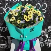 хризантема желтая кустовая ромашковая - 15 ., статица - 8 шт., салал, бирюзовая упаковка, лента. Примерный размер: 40Х40 см.