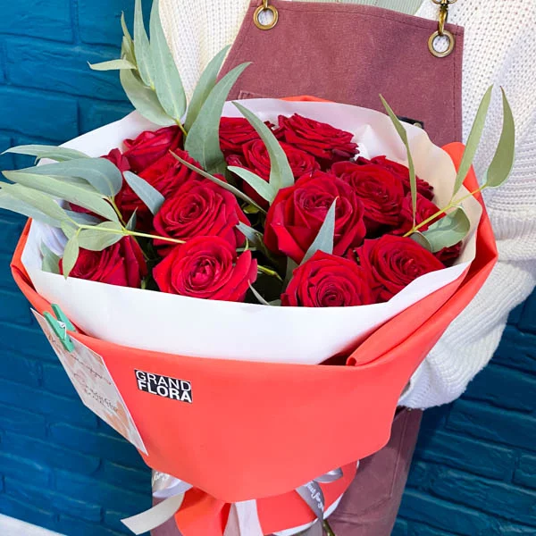Букет из красных роз, гармонично дополненный эвкалиптом, станет отличным поздравлением как для женщин, так и для мужчин.