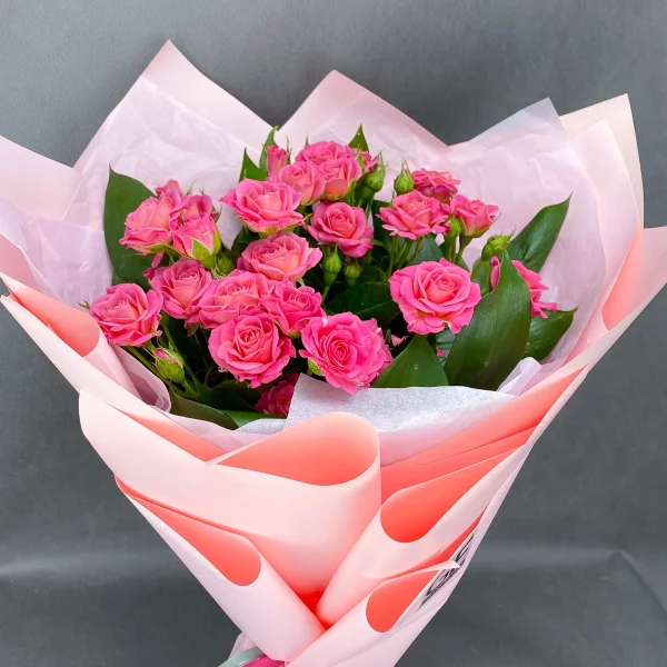 Стандартный: роза кустовая розовая /малиновая- 9 шт, упаковка, лента розовая. Примерный размер: 25Х25 см.